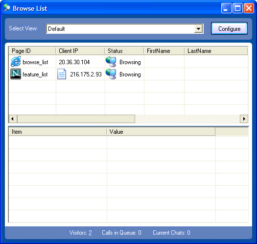 When a visitor enters your web site the Livehelper tracking code transmits a message to our server. Our server then tracks your visitors as they navigator through your web site. Based on this information your staff is able to monitor traffic on your web site in real time. Displayed below is an example of what your staff would see when monitoring your web site.